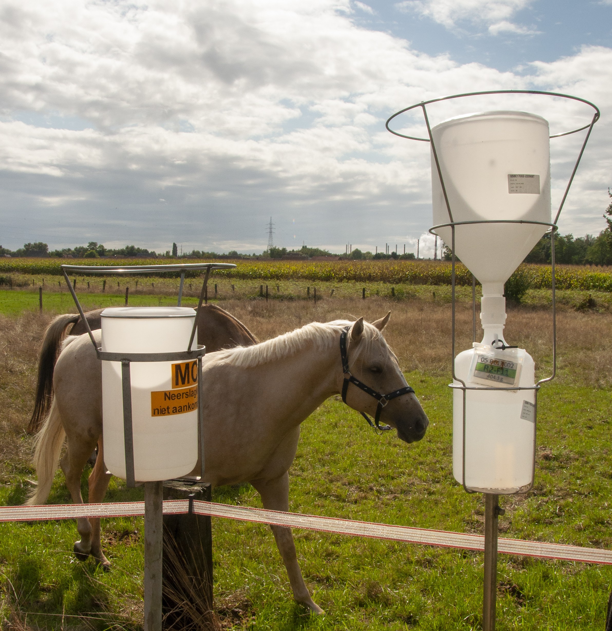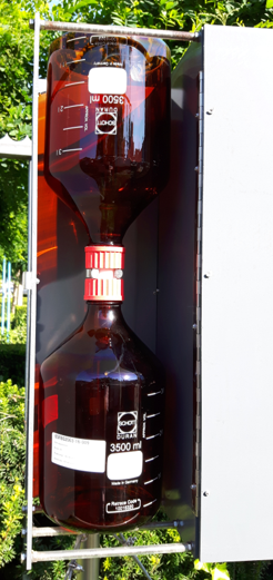 PAK’s in depositie worden gemeten volgens de norm EN15980. Hierbij plaatsen we een glazen ‘funnel-bottle’-kruik gedurende 4 weken op het veld om natte+droge depositie op te vangen.