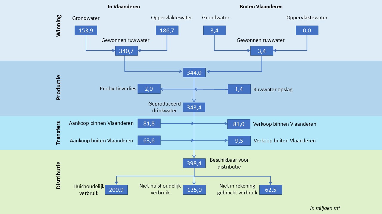 - Daarnaast kochten de drinkwaterbedrijven 63,6 miljoen m³ drinkwater buiten Vlaanderen.
