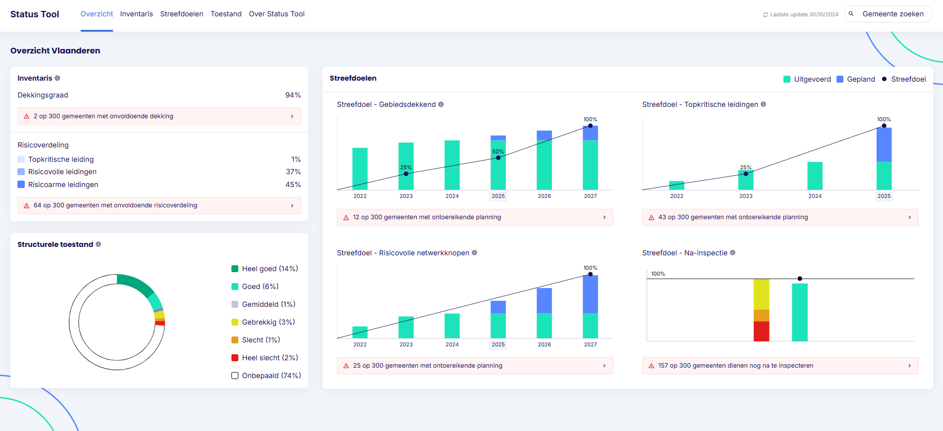 Die conceptnota bevat een concreet stappenplan om te komen tot meer inzicht in de toestand van het rioolstelsel in Vlaanderen. Deze statustool heeft als doel om de evolutie op dit stappenplan in kaart te brengen. Het dashboard wordt aangeboden door Aquafin NV en visualiseert de data die rioolbeheerders aan de Vlaamse Milieumaatschappij rapporteren.