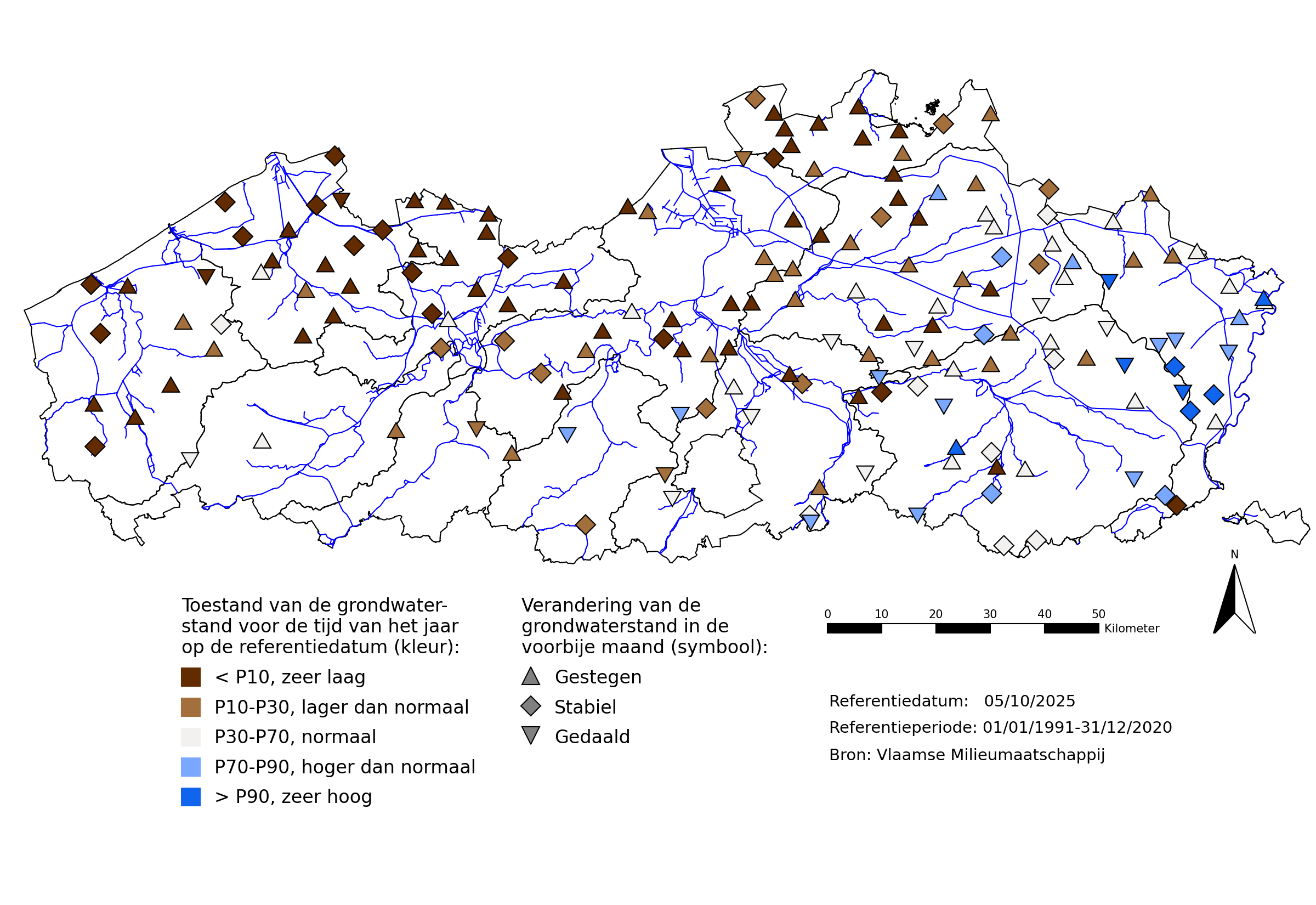 Op sommige locaties, vooral in het zuidoosten van Vlaanderen, zijn de grondwaterpeilen toch nog relatief hoog. Dat kan verklaard worden door de uiterst natte weersomstandigheden van 2024 die op deze locaties nog steeds doorwerken omwille van de natuurlijke karakteristieken van het watersysteem t.h.v. deze meetpunten.