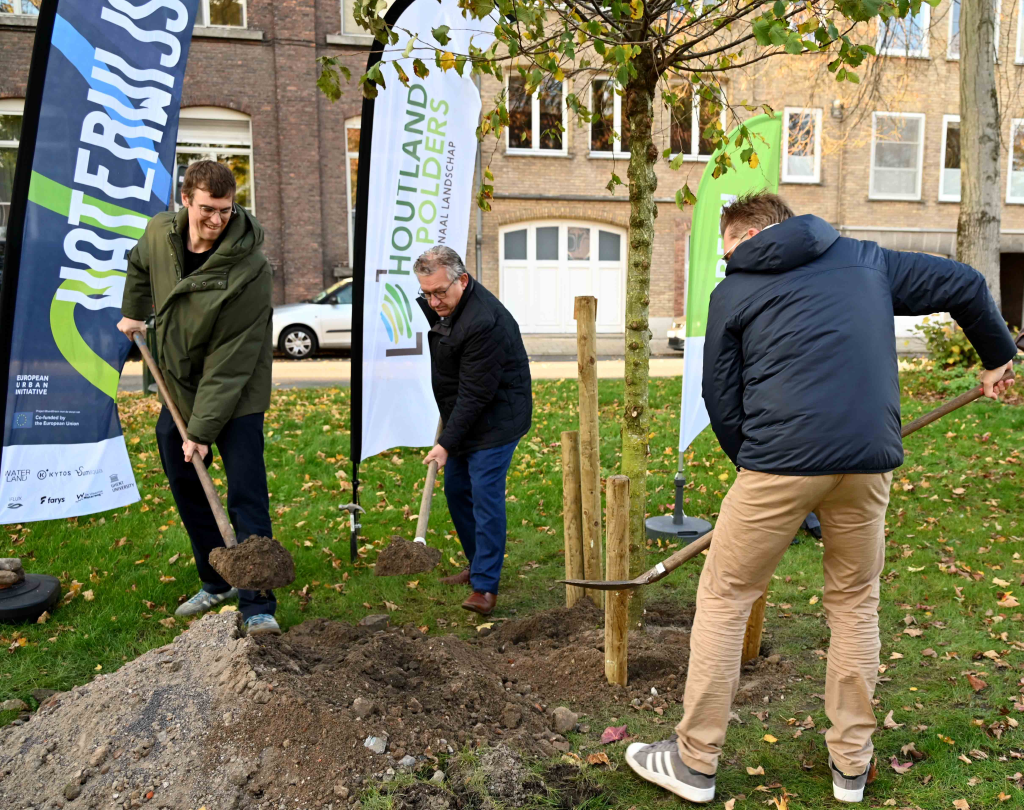 Klimaatadaptatie begint in de straat, maar vertaalt zich ook naar particuliere tuinen. Via tuincoaches worden inwoners ondersteund om hun tuin klimaatrobuuster te maken. De ambitie is duidelijk: elke druppel laten infiltreren waar hij valt. “In een waterstad als Brugge voelt Waterland zich helemaal thuis", legt Lieven Symons uit. “In de Magdalenawijk gaan we op zoek naar grote en kleine maatregelen om water en groen ruimte te geven in een dichtbebouwde omgeving. Ook op de waterzijde experimenteren we met andere functies en aandacht voor waterkwaliteit. Deze boom planten we als oproep naar de Bruggelingen in de wijk: elk idee of elke plek waar je mee aan de slag wil gaan, is welkom.”